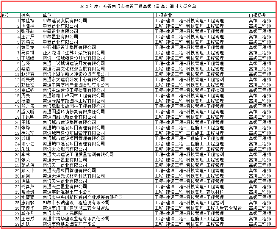 2025年度江苏省南通市建设工程高级(副高)评后公示人员名单