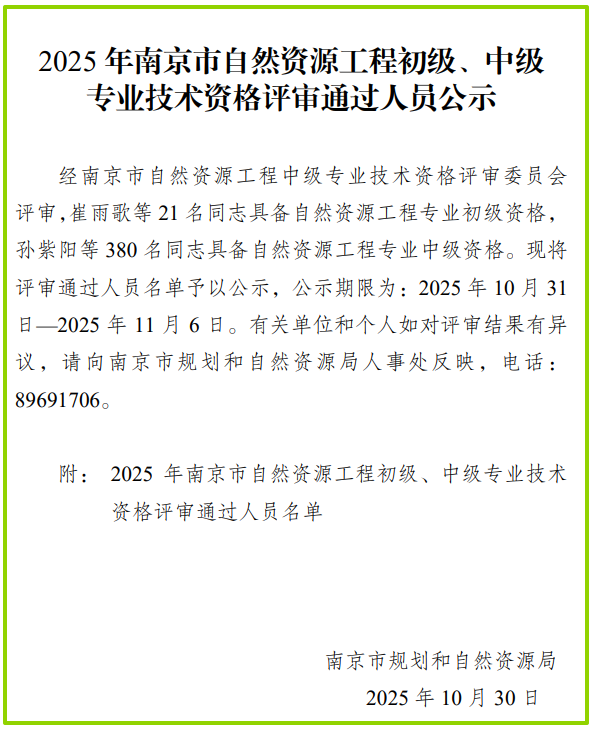 2025年南京市自然资源工程初级、中级专业技术资格评审通过人员公示