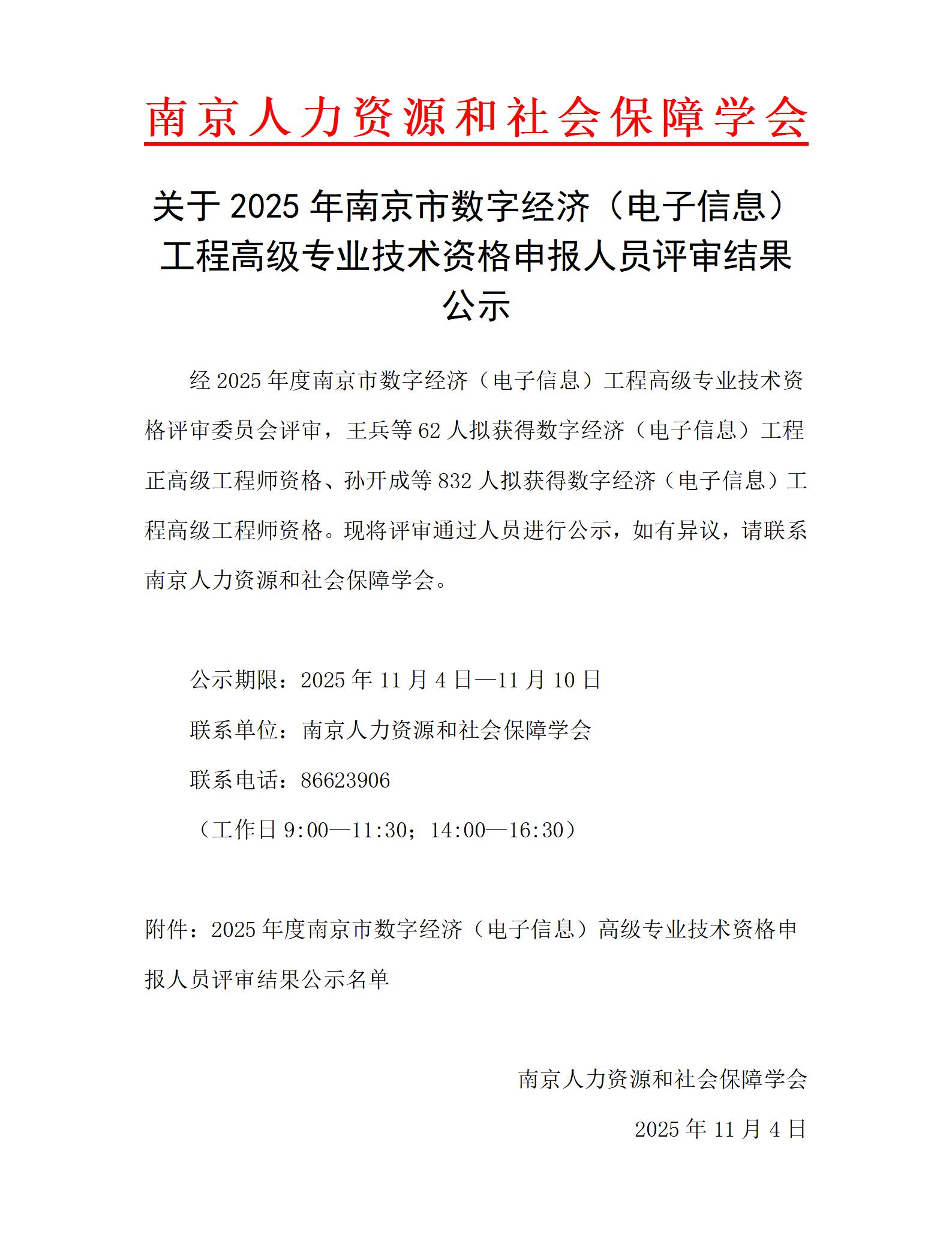 2025年南京市数字经济(电子信息)工程高级专业技术资格申报人员评审结果公示